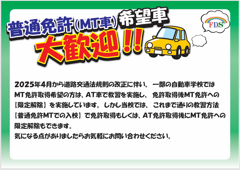 12月の「検定・休日カレンダー」が出ました。 教習生専用ページよりご確認ください。 2025.10.29 中型車両の車検終了いたしました。中型車両教習を再開いたします。 2025.10.18 それに伴い送迎バスの最終便(19:55発)が全線で完全予約制となります。尚、延長教習後のバスはありません。 詳しくは教習生専用ページよりご確認ください。 技能教習の予約枠追加は終了いたしました。 2025.08.16 令和7年9月1日~令和8年2月6日の期間限定で 普天間大山線を運行いたします。(平日、一日一便のみ) 時刻表及び、待ち合わせ場所については無料送迎バスのバナーより ご確認ください。 2025.06.24 オンライン学科受講で最後までみた際、終了画面が出ない不具合が発生しています。 症状が出た方はこちら教習生専用ページをご確認ください。 2025.06.11 熱中症予防の観点から二輪技能教習に制限を掛けます。 詳細については教習生専用ページよりご確認ください。 2025.05.29 無料送迎バス『宜野湾線』の停止場所に変更があります。 運用停止及び追加停止場所がありますので ご利用の方はこちらか事務所までお尋ねください。 2025.04.04 ・4/8よりオンライン学科講習中に小テストを行います。 詳しくは教習生専用ページよりご確認ください。 2025.03.12 学科受講についてお知らせがあります。 教習生専用ページをご確認ください。 |