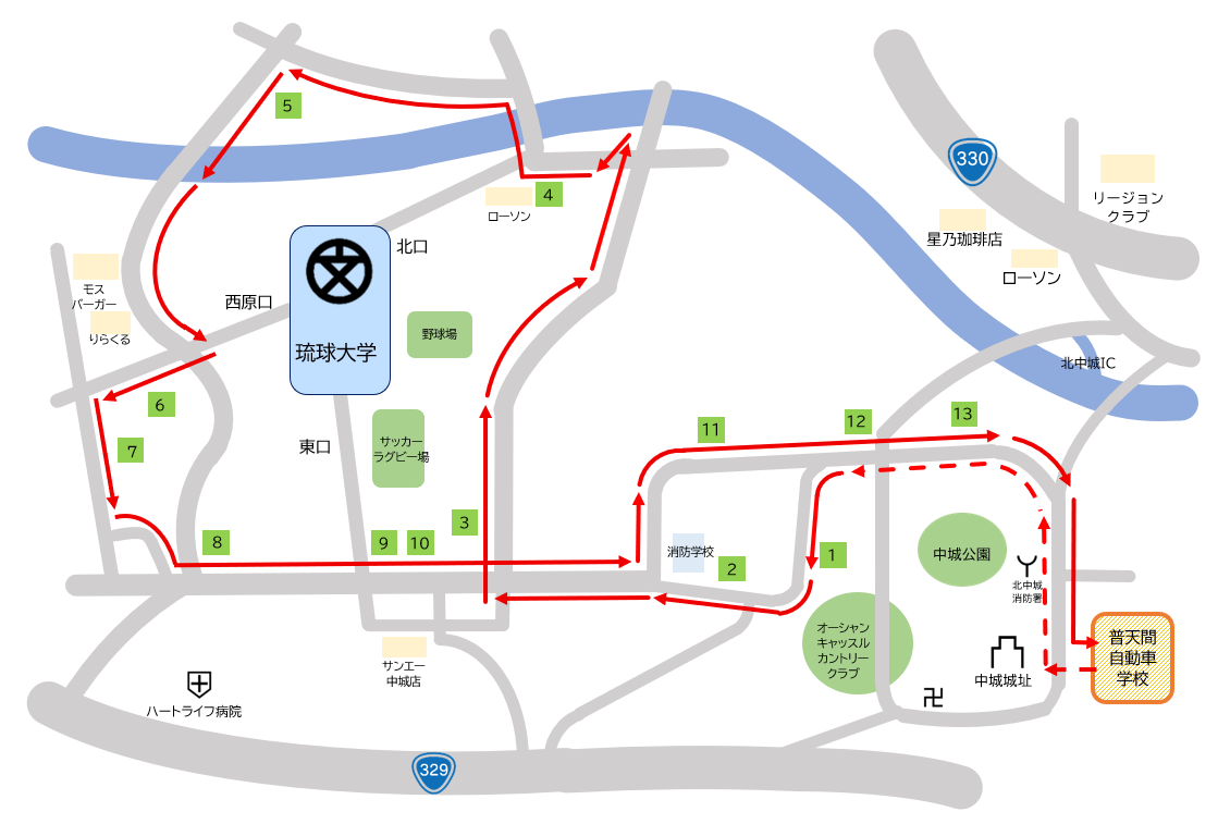 - バスが見えたら挙手をお願いします。(普天間自動車学校のバスである事を必ずご確認下さい。)