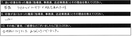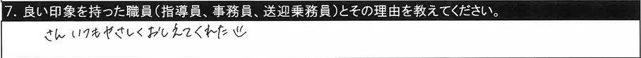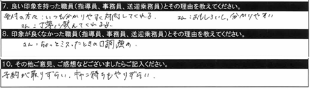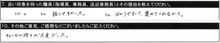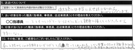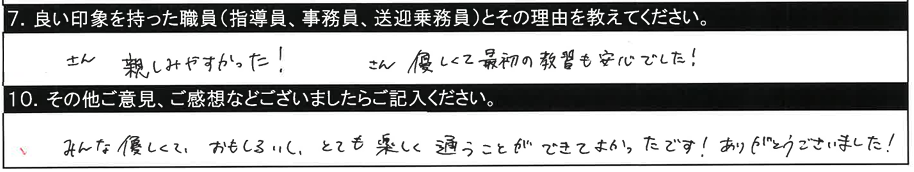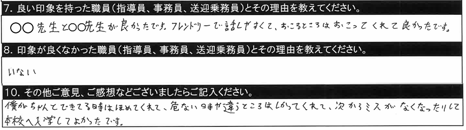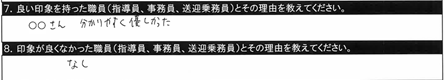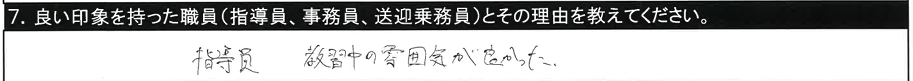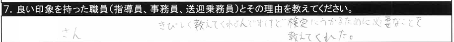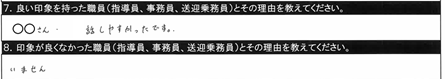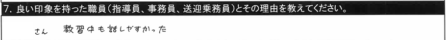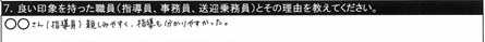 7.良い印象を持った職員/〇〇指導員、○○指導員、教習時間外に話しかけてくださいました。