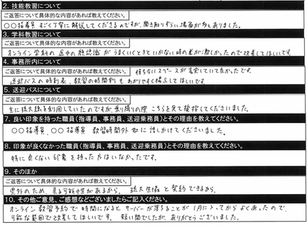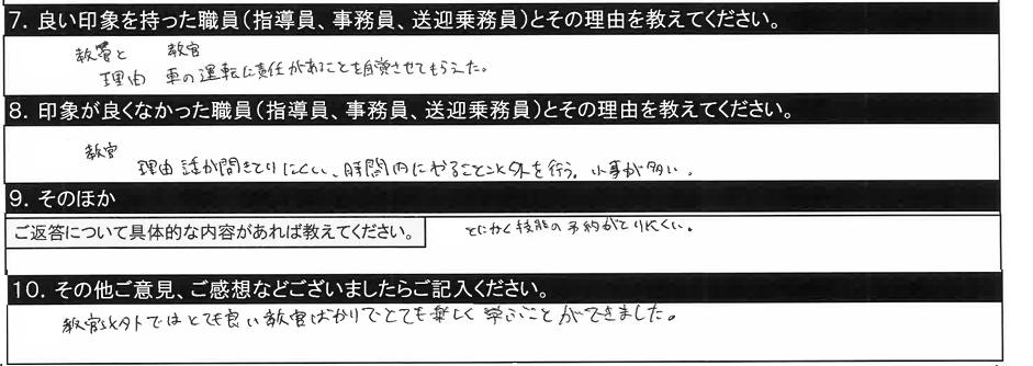 10.その他ご意見、ご感想/オンライン教習予約で時間になるとサーバーが落ちることが1月に入ってからよくあったので可能な範囲で改善してほしいです。短い間でしたが、ありがとうございました。 |
