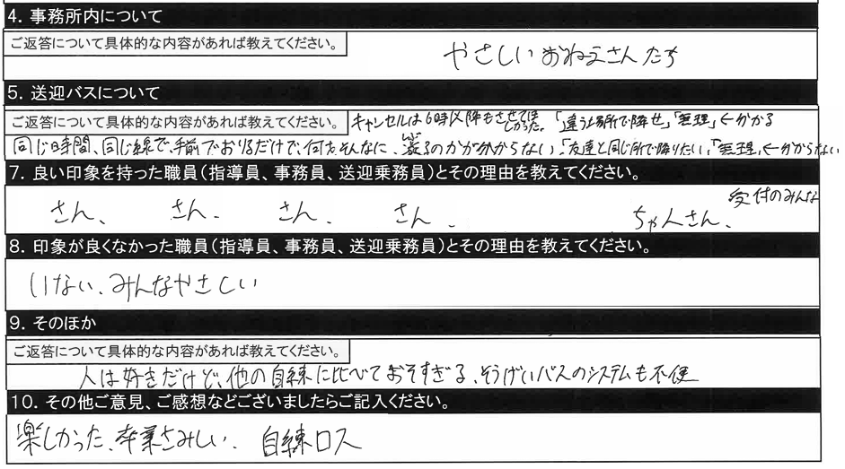 4.事務所内について/待合スペースが充実していて良かったです。送迎バスの時刻表、教習の時間割もわかりやすく掲示して欲しいです。